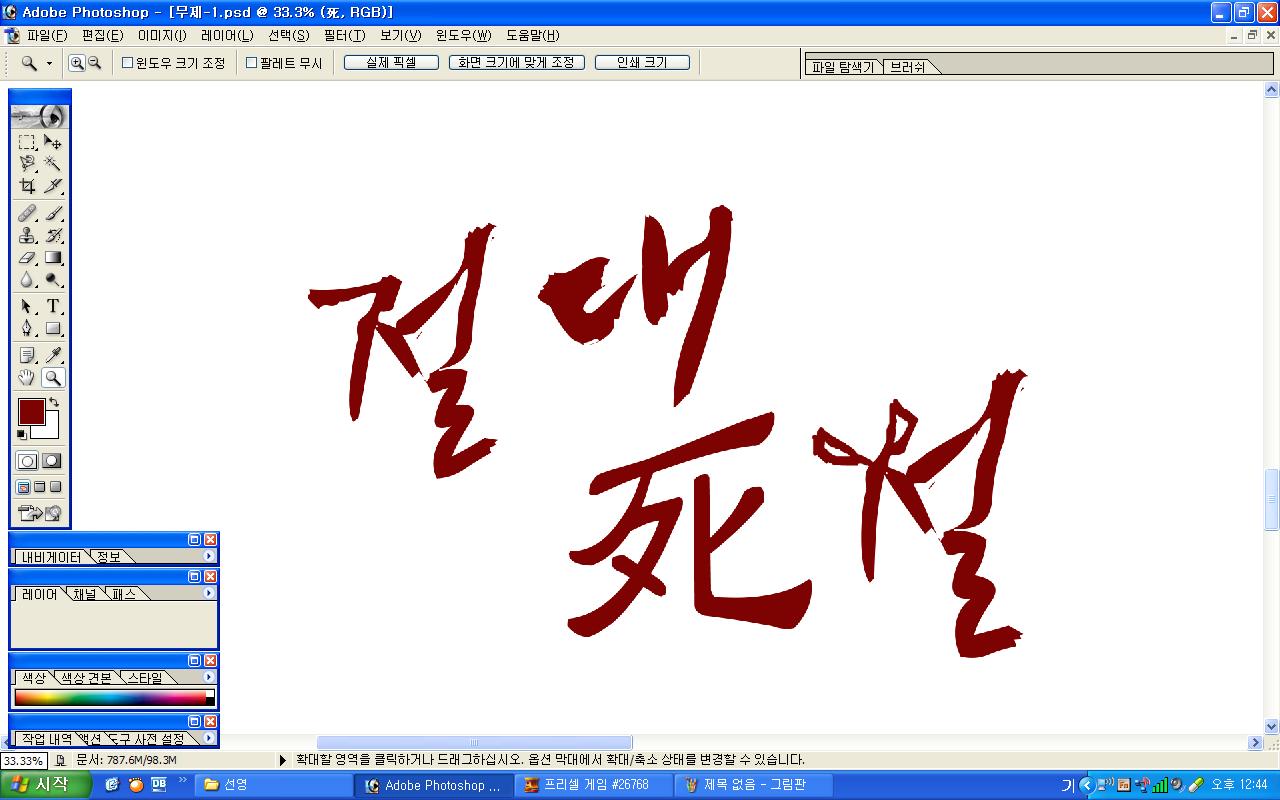 정중히 캘리 부탁드립니다. -_- 류재철 일반 0 5806 2009.11.16 11:18 실력자 분들이 많이 계셔서 이렇게 염치없게 부탁드립니다. - 절대死절 : 첨부한 파일 참고해주시면 감사하겠습니다.(약간 거친느낌? ^^;;) : '절'자의 ㅈ은 가위로...^^;; : 포스터 제작용이라 ai 파일이 필요합니다. 대학동아리 연극공연 포스터로 쓸 예정입니다. 비상업적인 공연이라 이렇게 부탁드립니다.